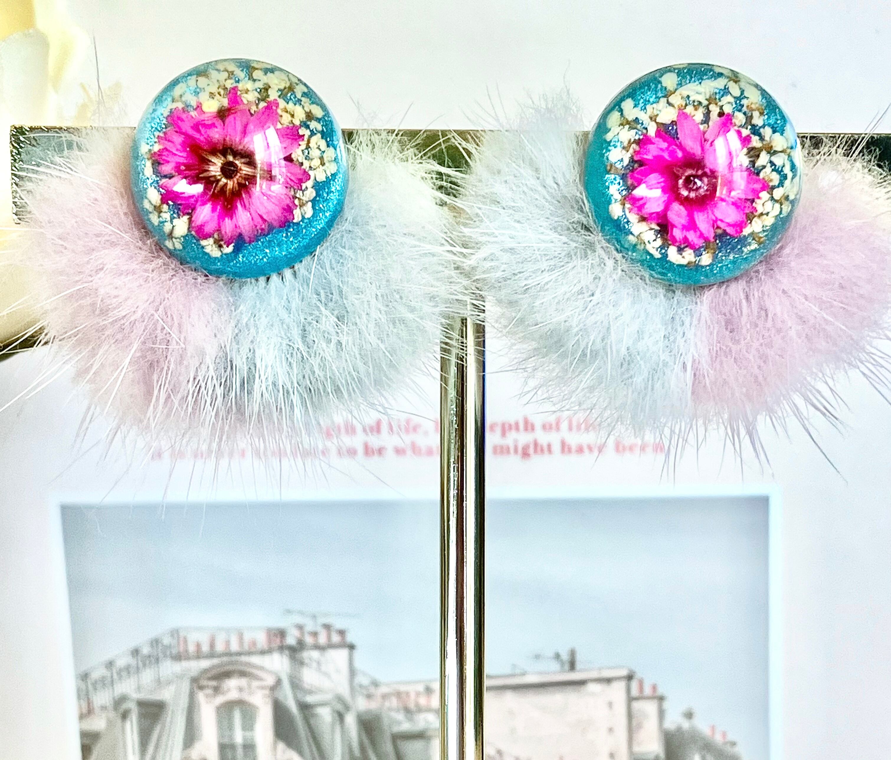 ドライフラワーとファーの2wayサージカルステンレスピアス color pink