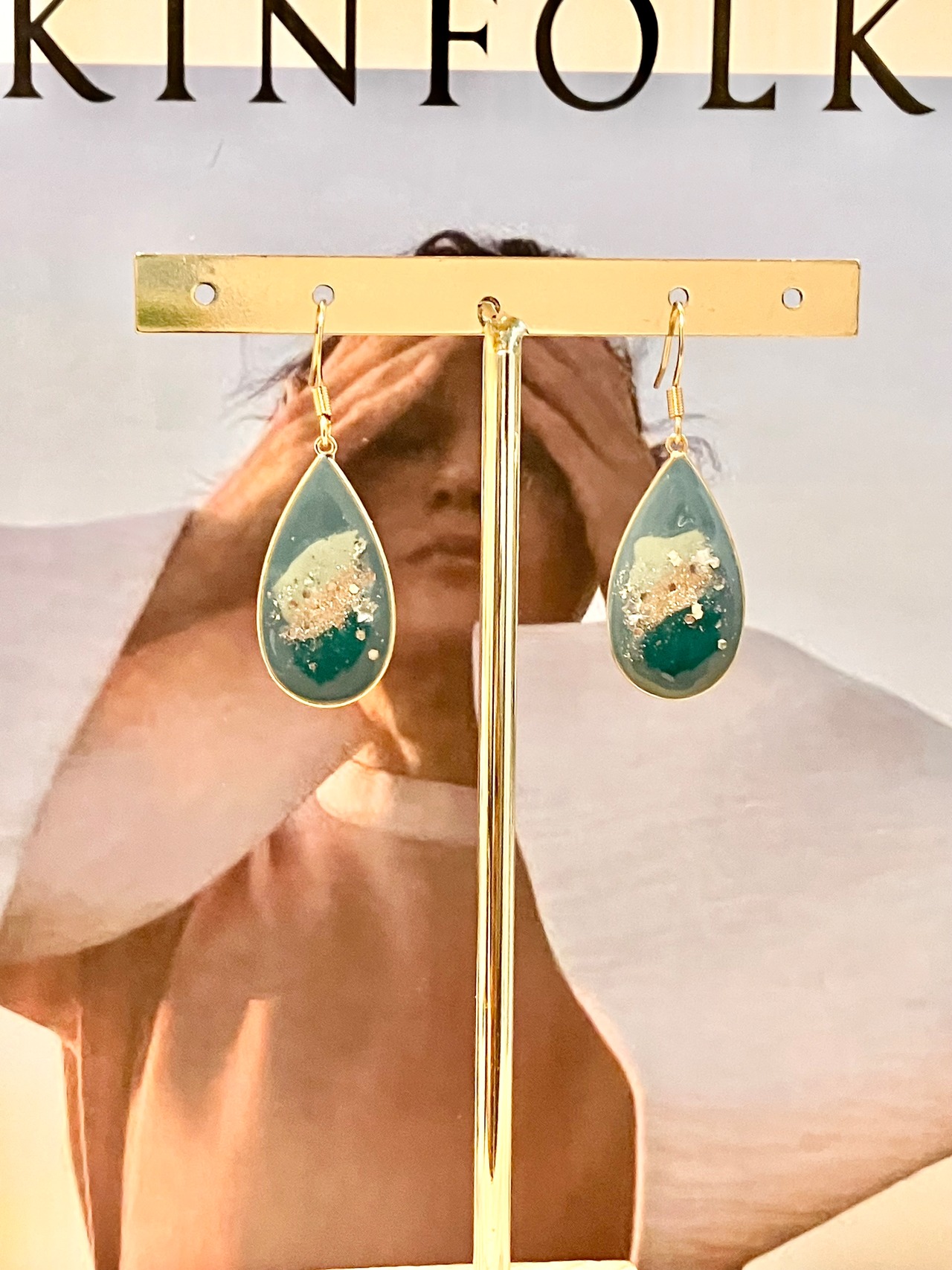 アートなデザインのくすみBlueカラーしずくチャームのサージカルステンレスのフックピアスです。