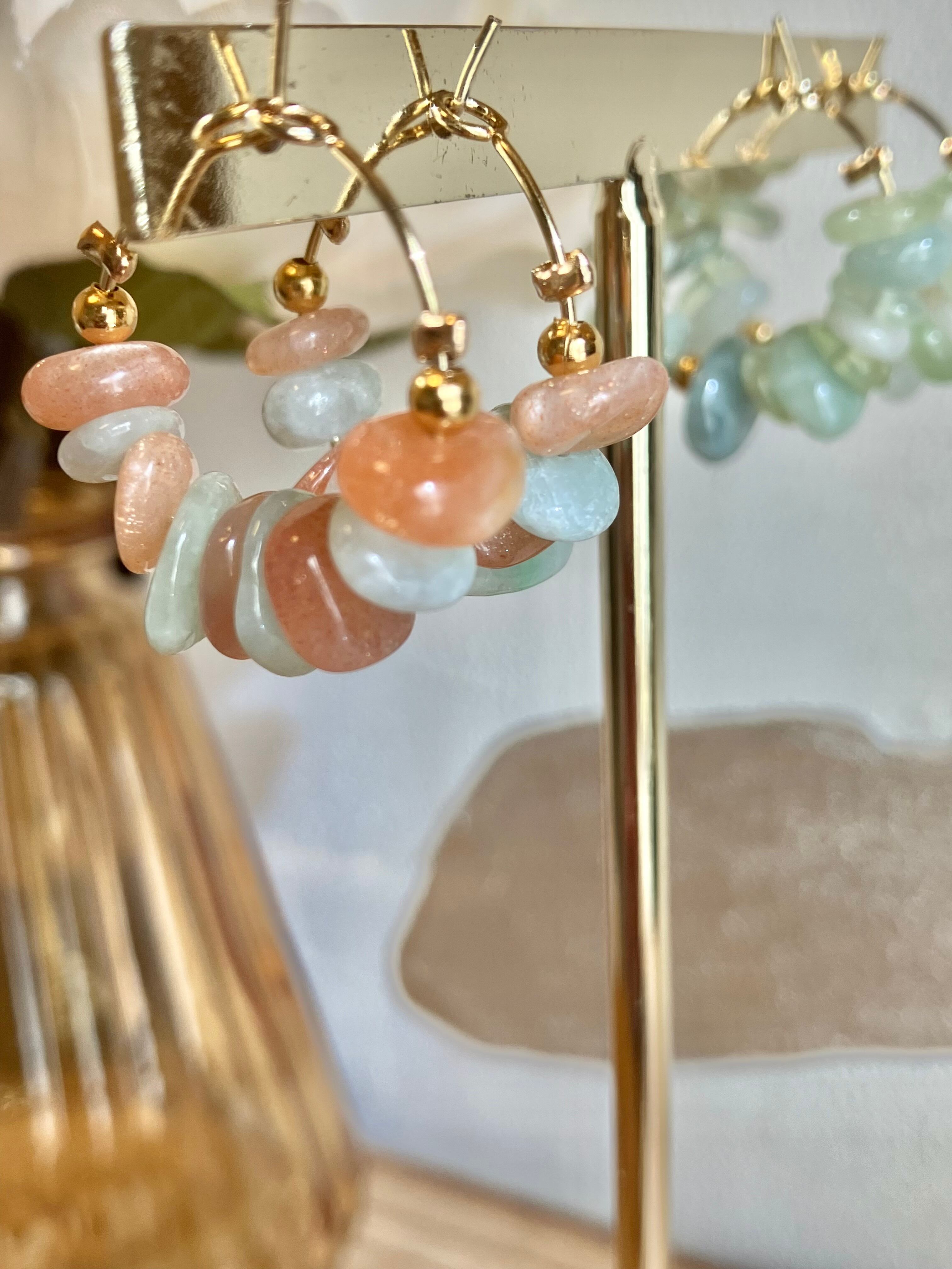 天然石サンストーン×翡翠 サージカルステンレスフープピアス